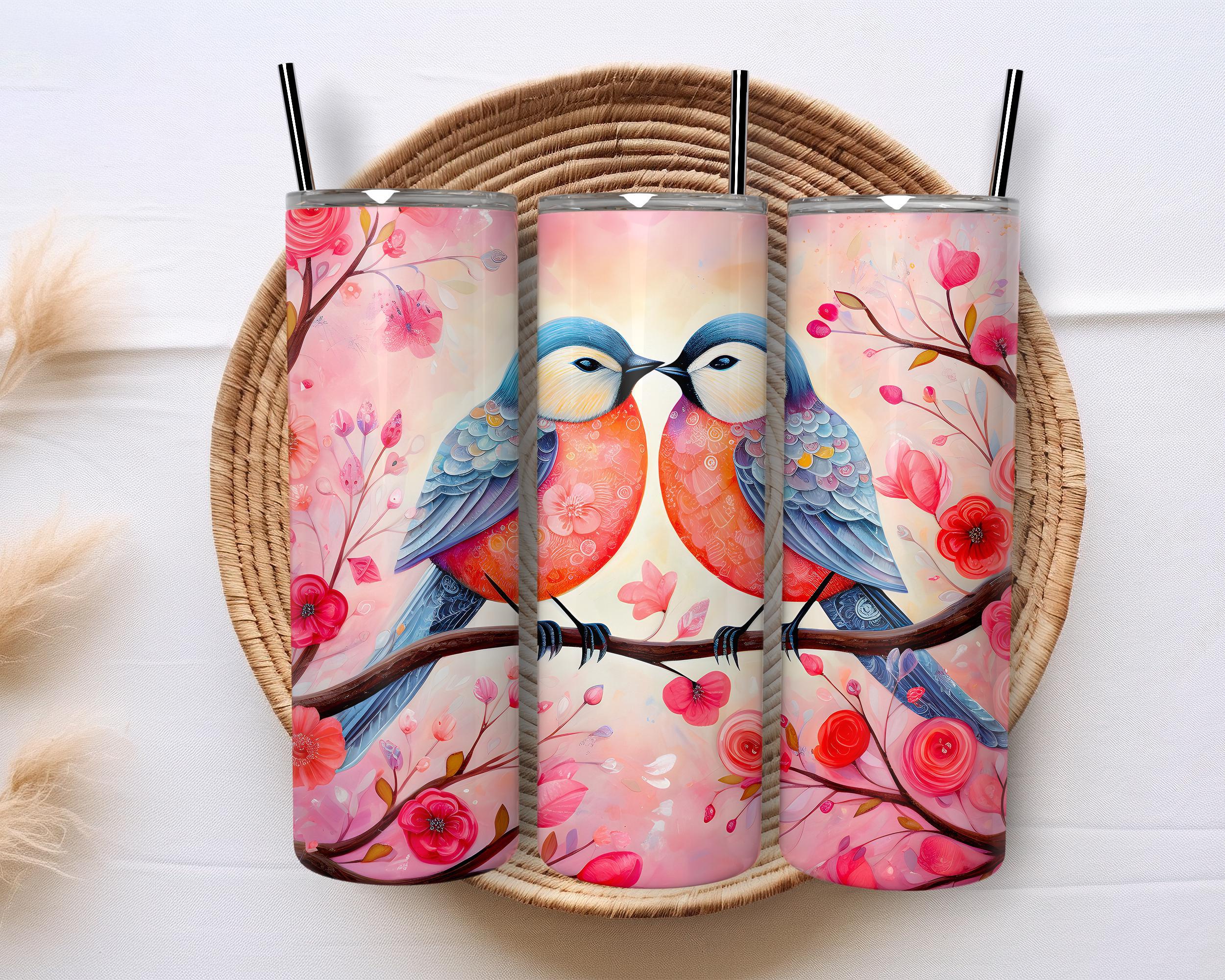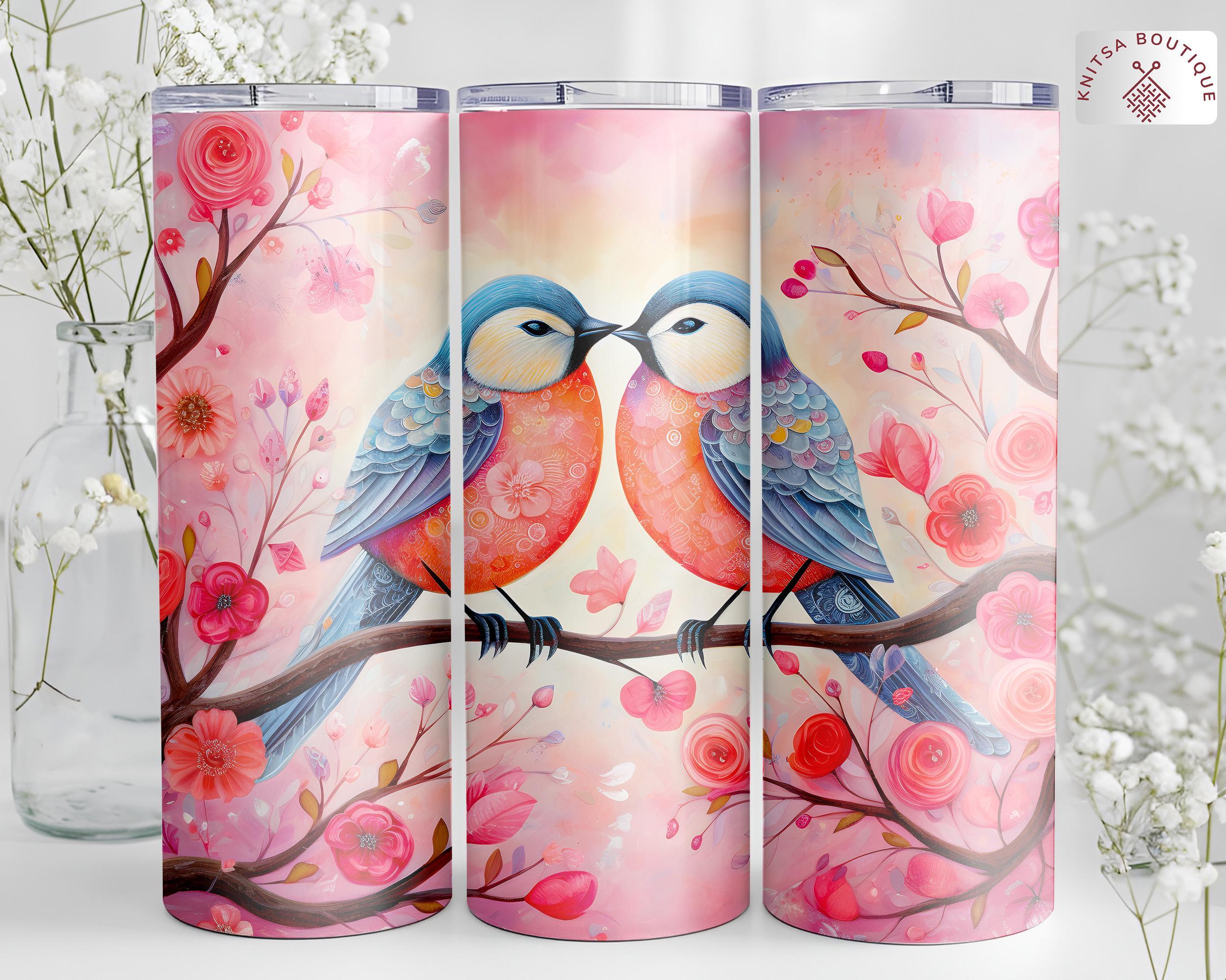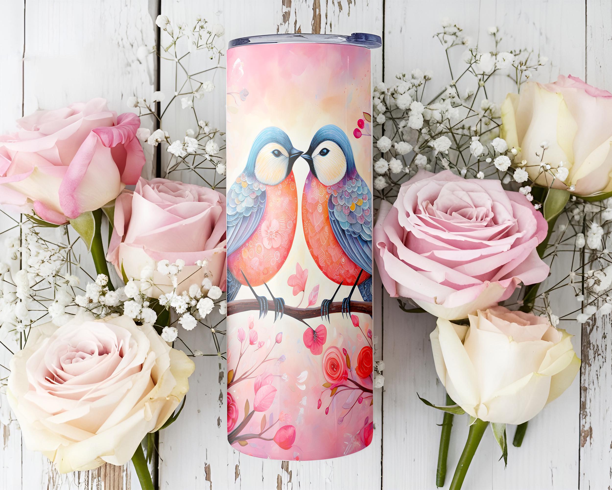 Romantic Love Birds Valentine Tumbler, Cute Pink Red Floral Couple Drinkware, Sweet Heart Valentines Day Gift for Couples, Bird Lover Gift