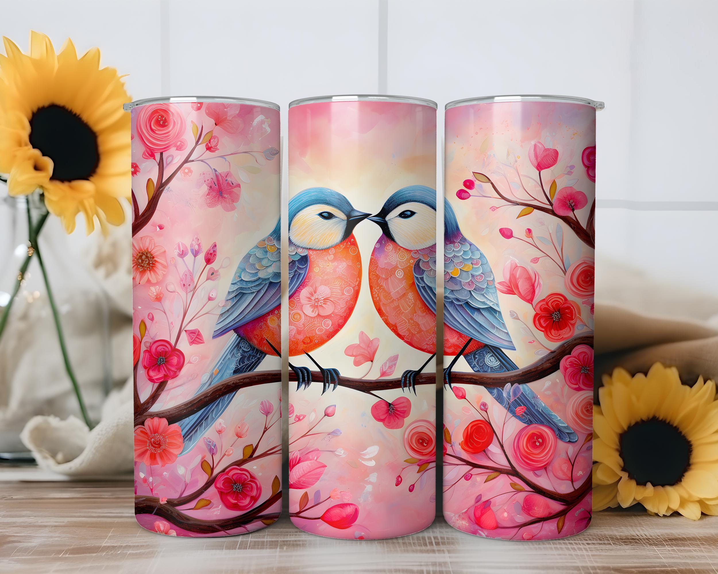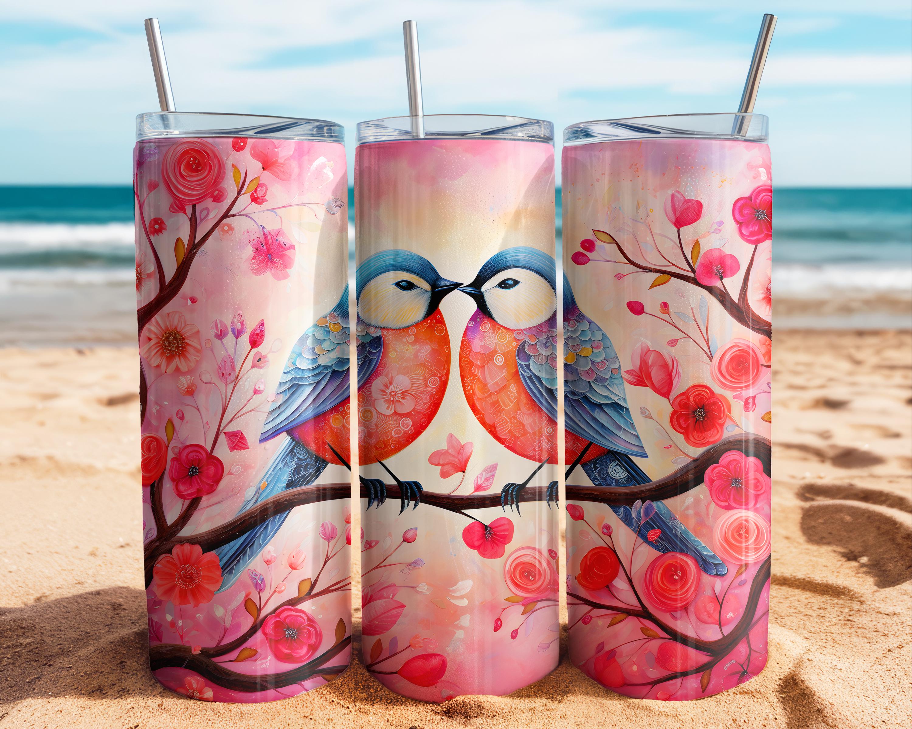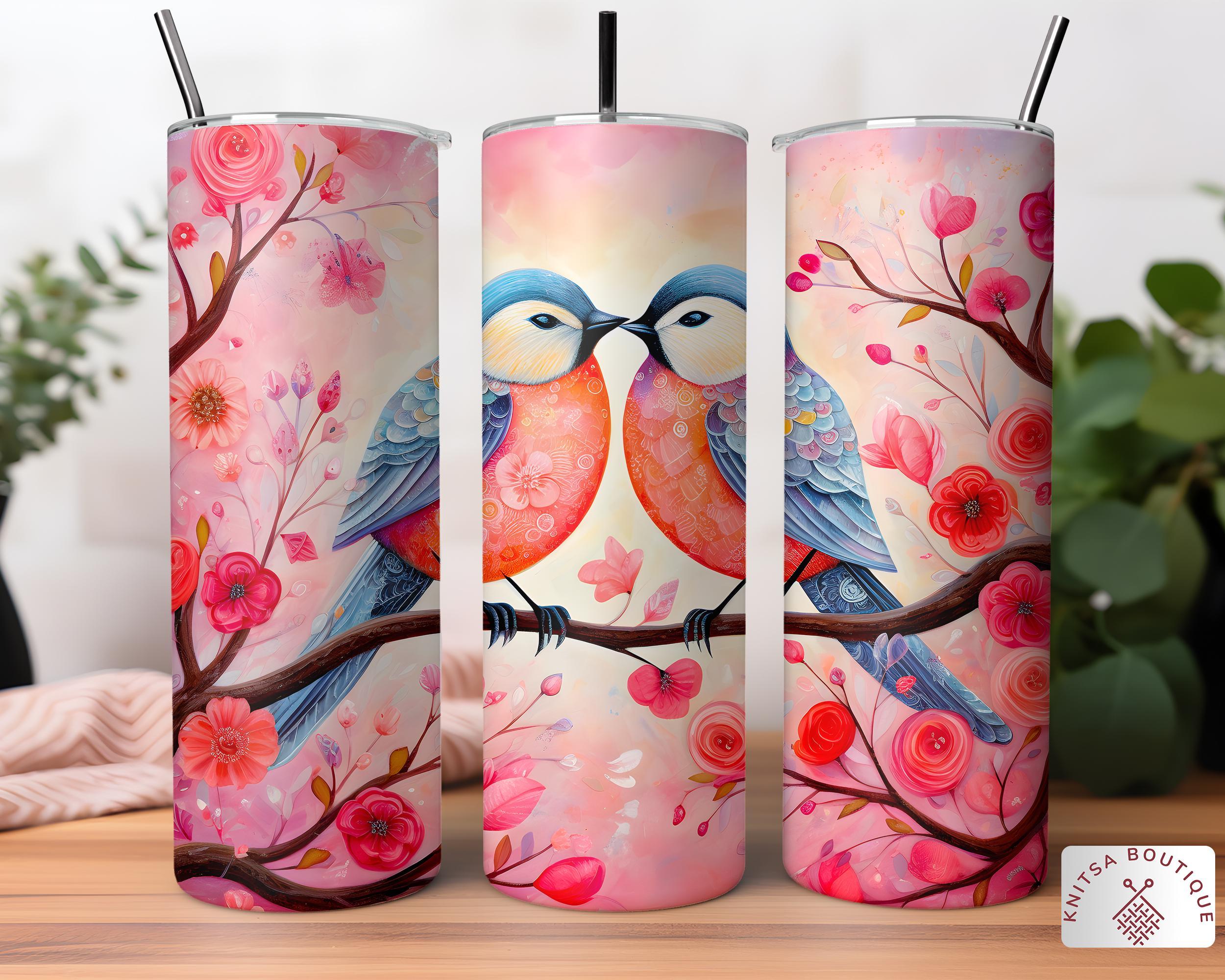Romantic Love Birds Valentine Tumbler, Cute Pink Red Floral Couple Drinkware, Sweet Heart Valentines Day Gift for Couples, Bird Lover Gift